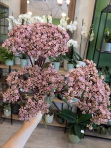 En automne nous retrouvons aussi les sedums qui sont déjà présents en été. En plantes ou en fleurs coupées, les sedums sont des fleurs robustes apportant volume et délicatesse avec leurs jolies petites fleurs délicates.