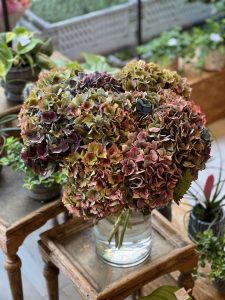 l’hortensia, fleur d’été qui continue sa floraison jusqu’en automne. Nous en avons de magnifiques sur septembre/octobre, ce sont d’ailleurs ceux qui sèchent très bien tête en bas pour ceux qui souhaitent en profiter plus longtemps !